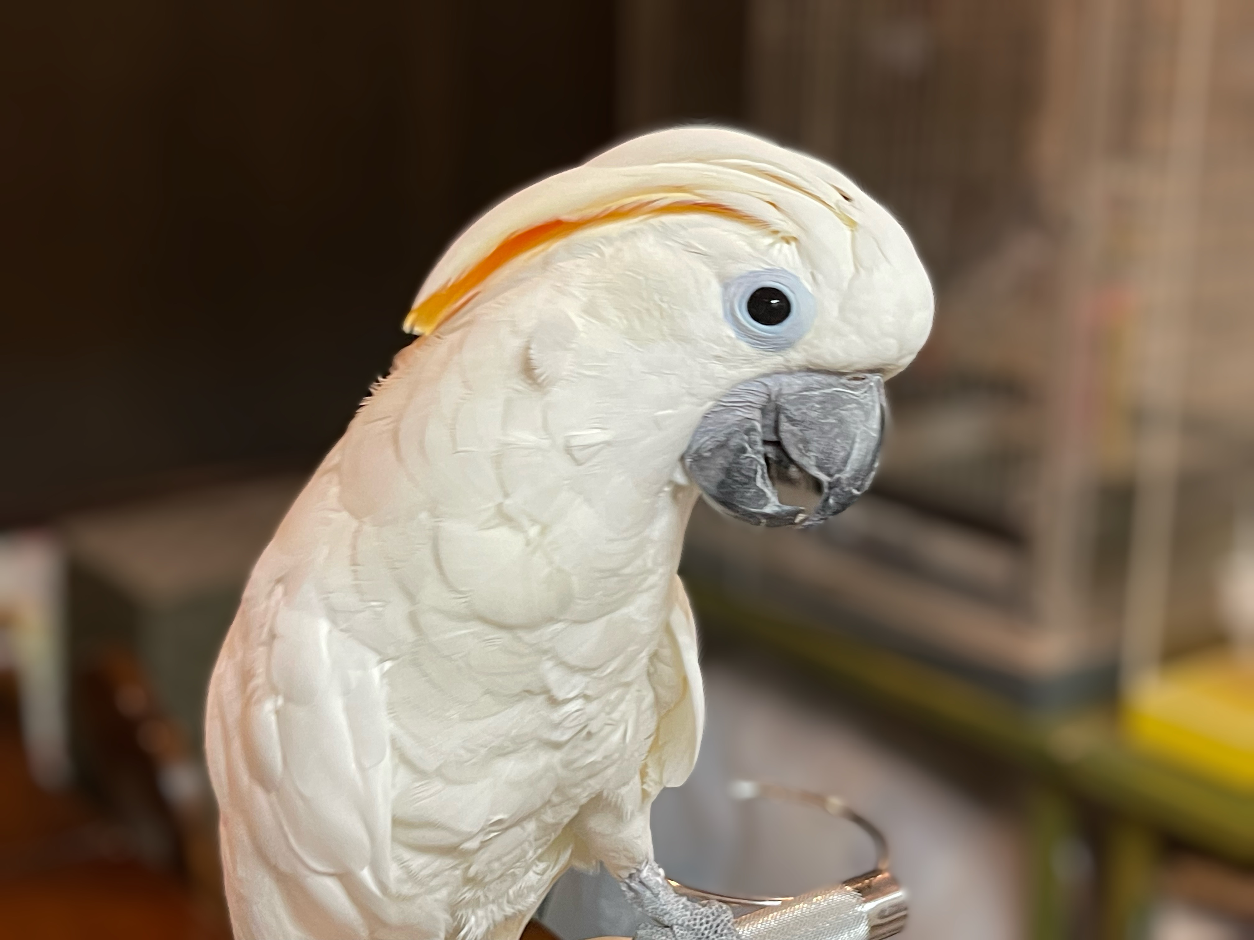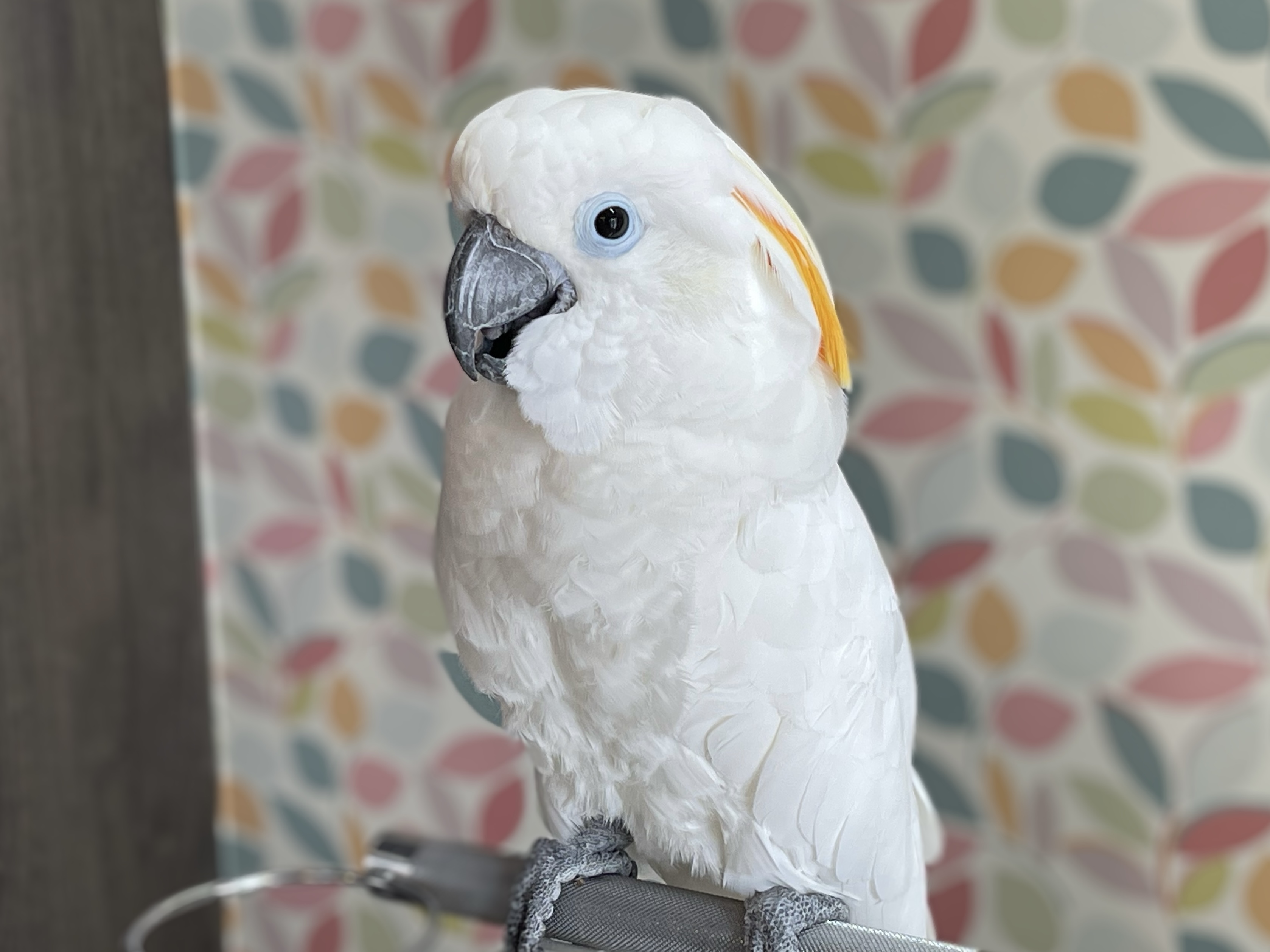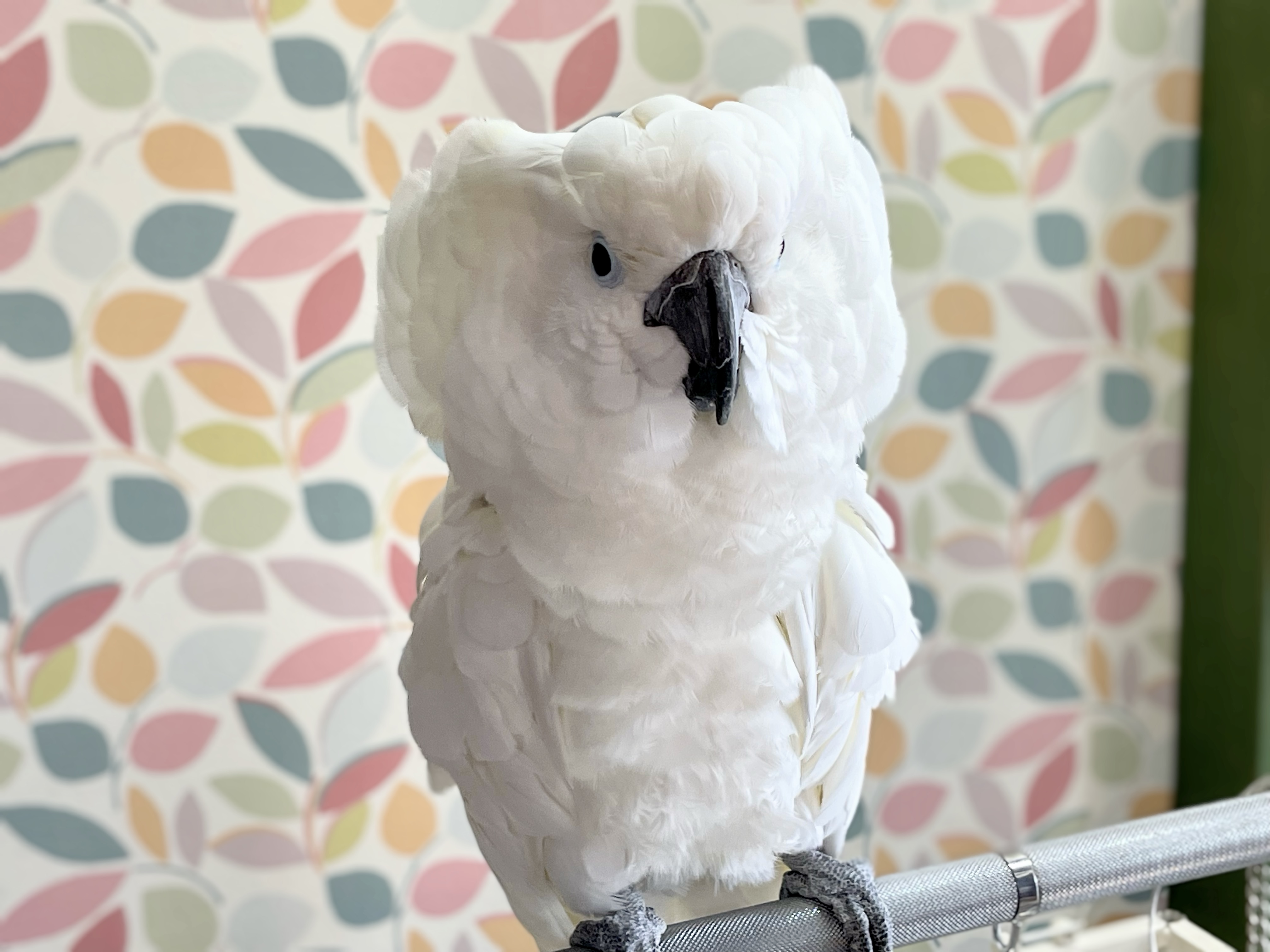 オオバタンとルリメタイハクオウムの交配種と推定される、非常に珍しいハイブリット個体が入店しました。東南アジア産まれで、全身が美しい白色を基調とし優雅な姿をしています。体格や雰囲気はオオバタンに近く、存在感と気品を兼ね備えた1羽です。