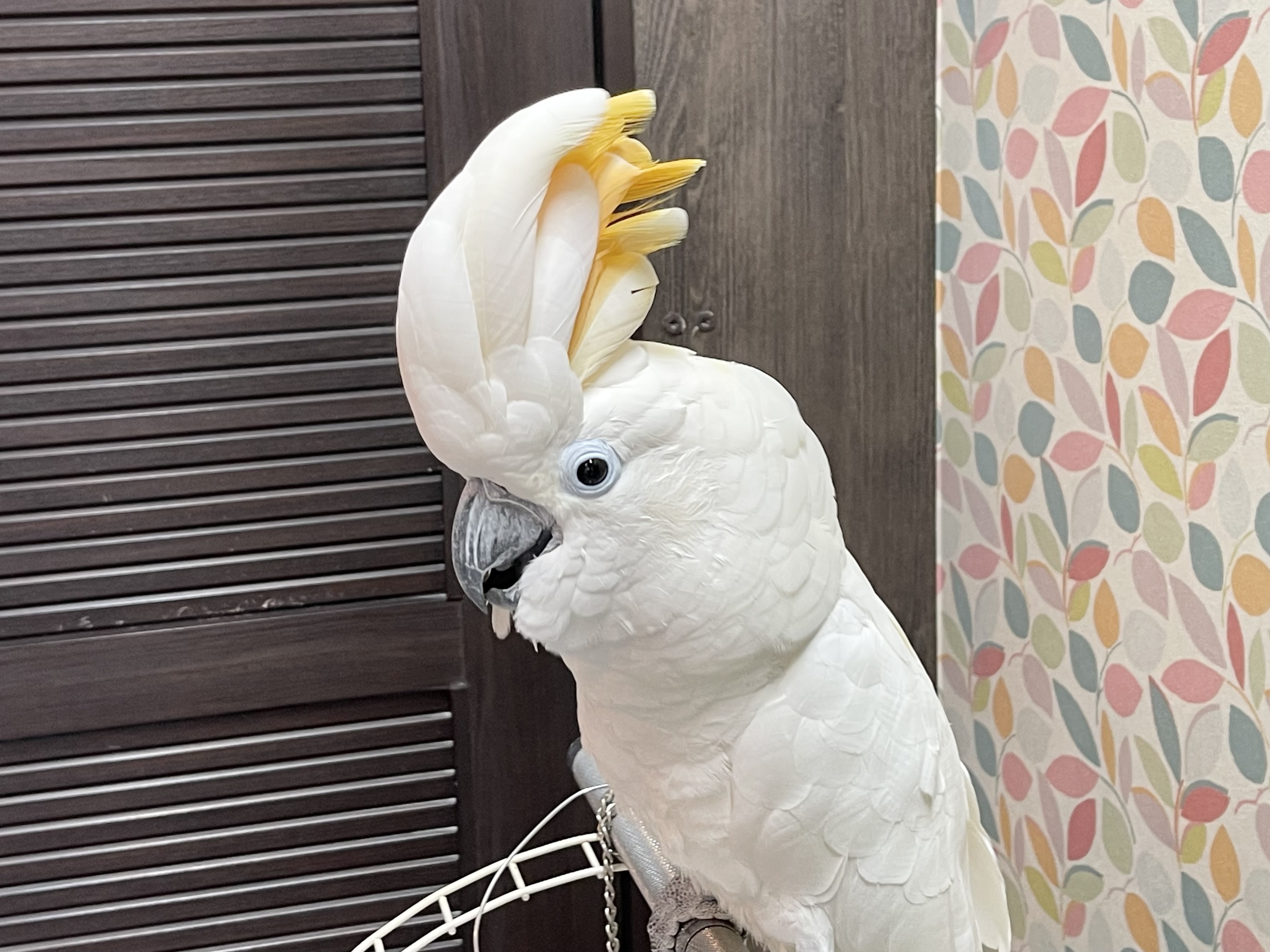 羽毛のふくらませ方や仕草にもオオバタンらしさが感じられます。